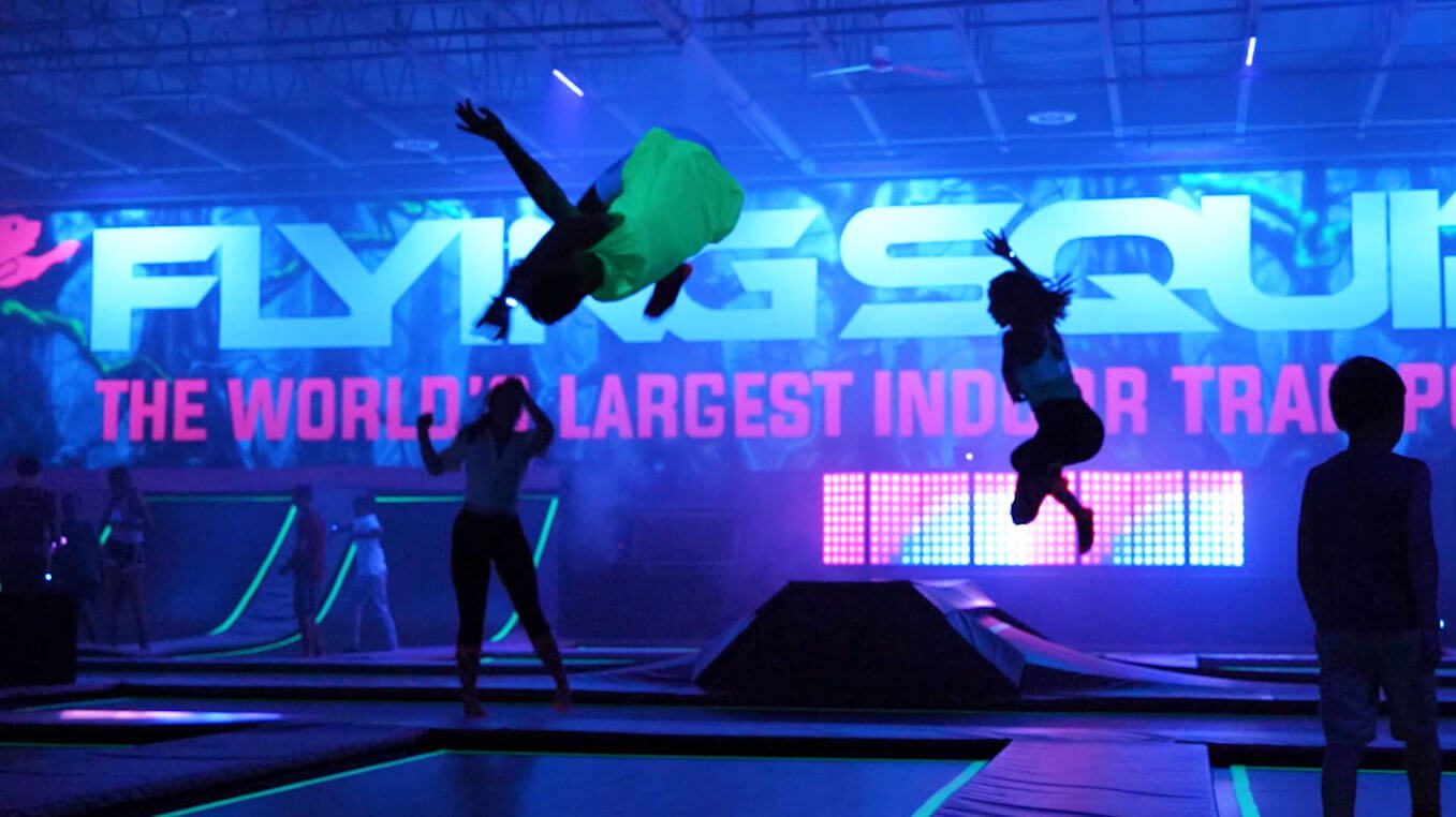 Every Friday and Saturday night from 7:00pm to 9:00pm, Flying Squirrel transforms into the hottest-all-ages spot in the city! We fire up the lasers, black lights, and more! It is $30 per jumper for 2 hours of cosmic fun and trampoline socks are required